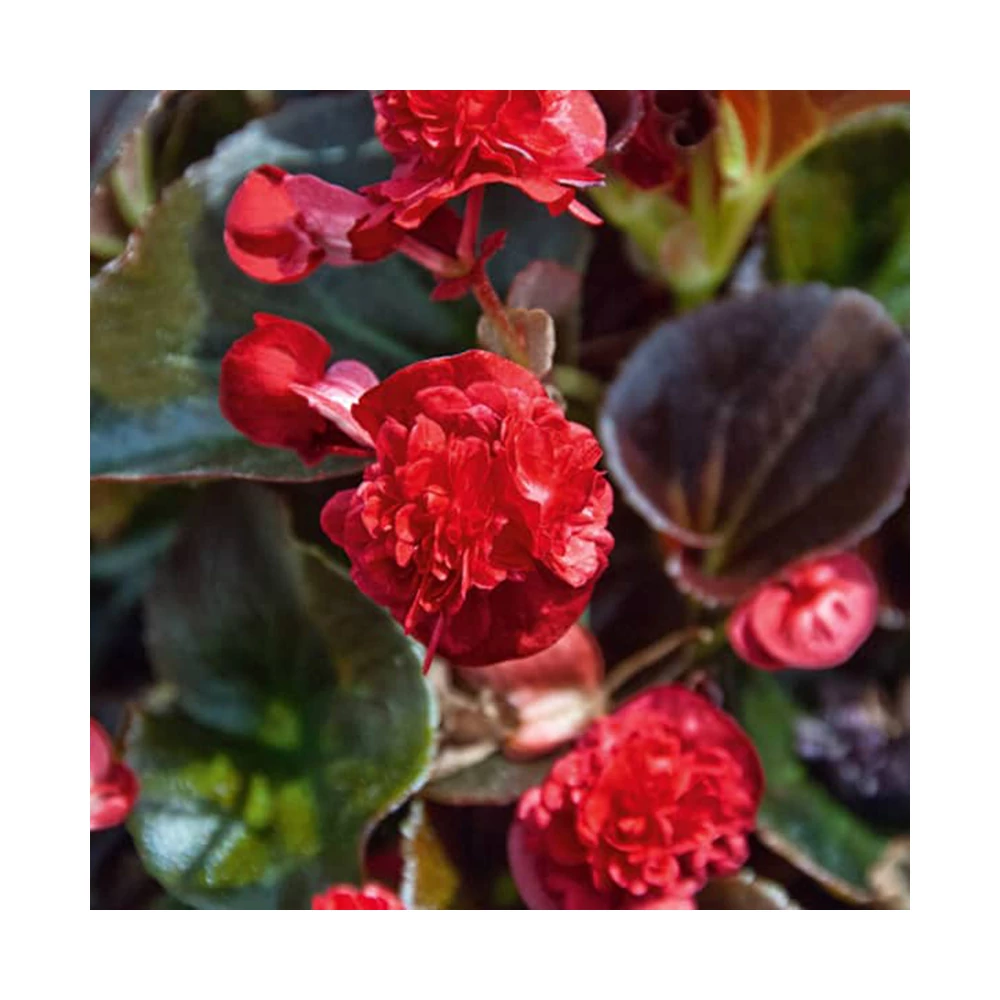 Begonia GUMDROP 'Coco Red' (Dupla virágú begónia): Egyik kedvenc növényünk ez a kb. 30 cm-es bokorrá kifejlődő begónia, melyet tűző napon, vagy félárnyékban egyaránt szinte betakarnak az apró, gömbszerű, teljesen telt virágocskák. Alkalmi kiszáradást is elviselő, ápolásra igénytelen, akár sírokra is ajánlható, megbízható növény.
