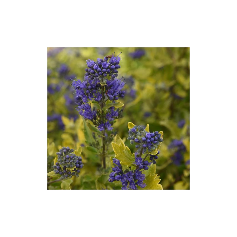 Caryopteris x cladolensis 'Gold Crest' (Kékszakáll): Ha tavaszonként nem vágjuk vissza, néhány év alatt 70-80 cm-es bokrocskává nő meg. Aranysárga levelei és a nyár végén megjelenő, kék virágai, gyönyörű színkontrasztot képeznek. Virágai illatosak, méhek, rovarok kedvenc leszállóhelyei. A levél, intenzív aranysárga színét, megtartja erős napsütésben is.