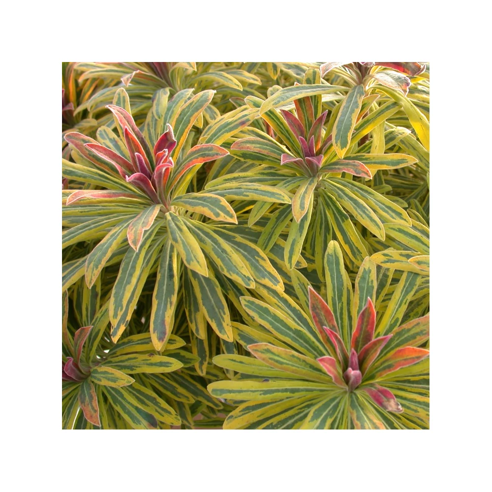 Euphorbia martinii hybr. 'Ascot Rainbow' (Kutyatej): Talán a legszebb évelő kutyatej fajta, rendkívül mutatós hosszúkás világoszöld leveleivel, melyek aranysárga szegélye a hűvösebb idő beálltával vörösesre vált. Örökzöld, télálló, jól elágazó bokra 50 cm magasságra nőhet 1-2 év alatt. Április-májusban hozza citromsárga virágait, melyek tulajdonképpen színes murvalevelek. A kutyatejfélék a legkisebb sérülés esetén is fehér színű tejnedvet választanak ki, amely háziállataink számára elfogyasztva mérgező, hozzáérve allergiát válthat ki. Elhelyezésénél, a vele való munkánál ezt vegyük figyelembe.
