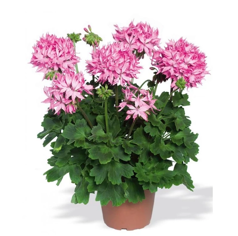Fireworks Pink: Közepesen erős növekedésű, életerős, időjárás-álló fajta. Hegyesen karéjozott és szépen díszített levelei felett folyamatosan megújuló rózsaszínű virágai csillag formájúak.
