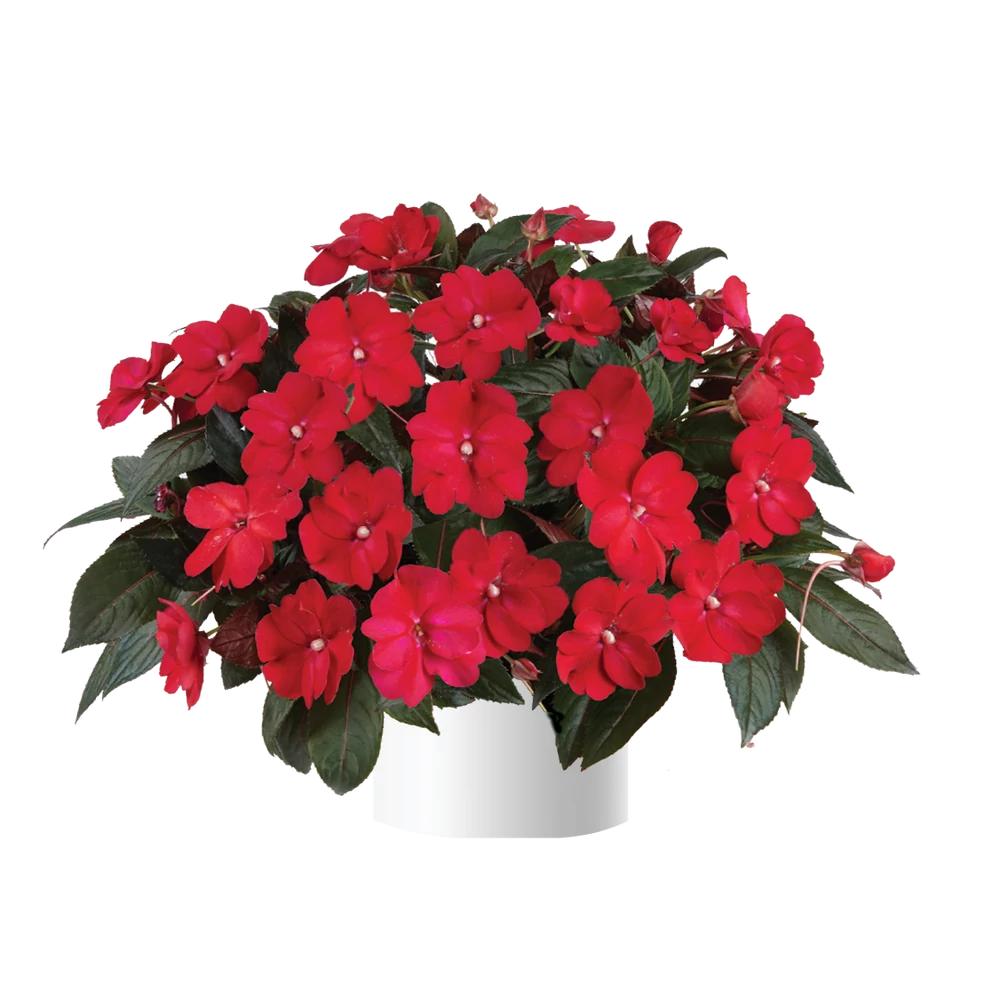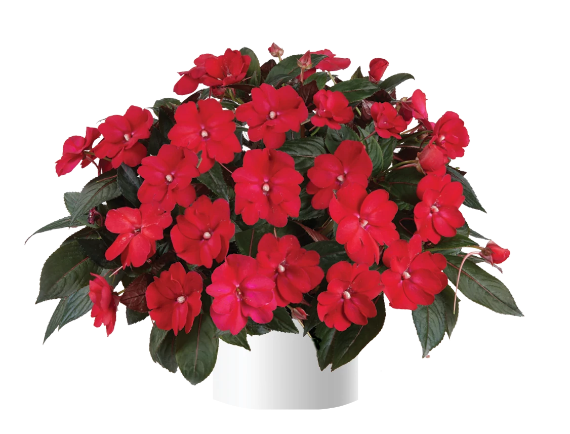 Impatiens Sol Luna 'Red' (Nap- és hőtűrő nebáncsvirág): Napsütést, hőséget és árnyékot egyaránt jól tűrő sorozat. Nagy edényben nevelve, vagy kiültetve, 25-40 cm-re is megnő, bőven virágzik egész nyáron.