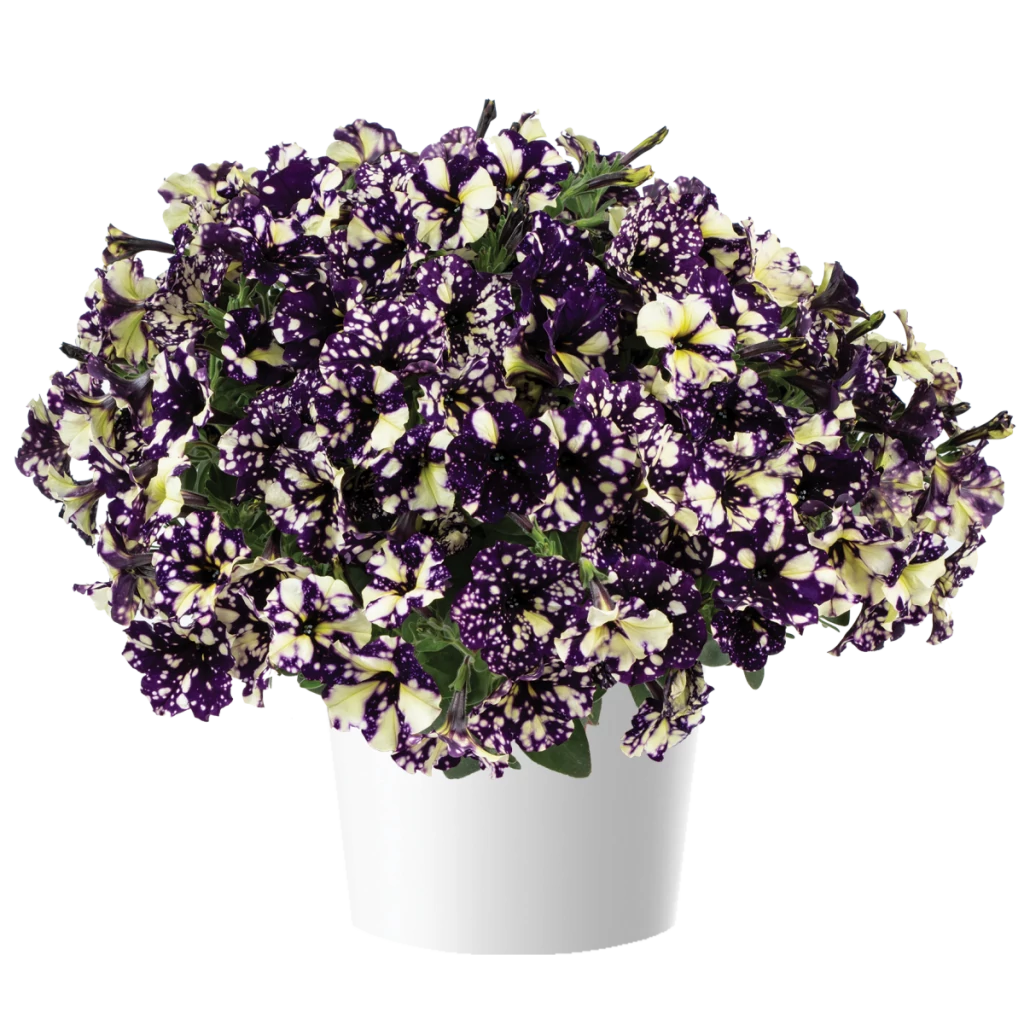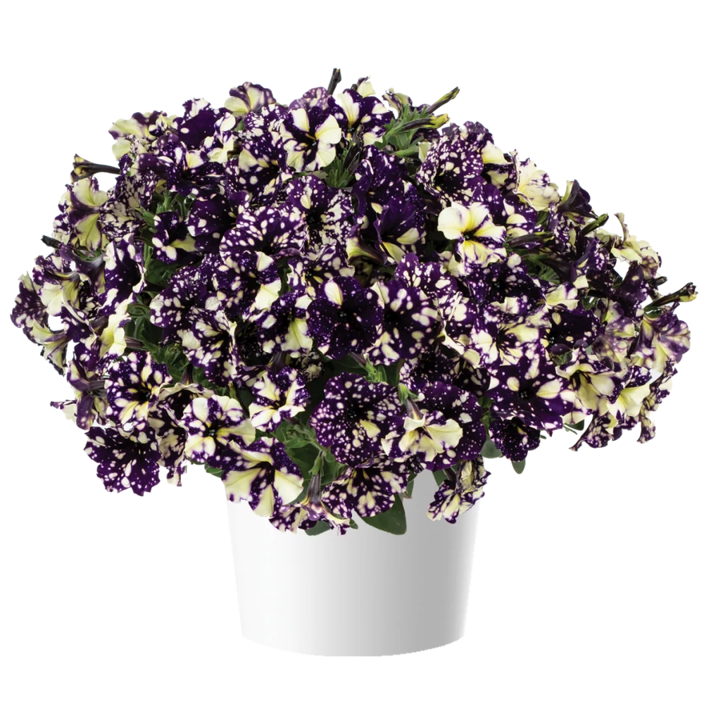 Petunia Splash Dance Violet Vogue: Különleges, vonzó színhatású, pettyezett mintájú szirmaival tűnik ki ez a fajta. A mintázatot a forró nyári napokon is megőrzi, ami azért fontos, mert az ilyen virágmintázat, nagyon sok dísznövénynél, a nyári magas hőmérséklet hatására eltűnik. Kissé lefutó, sűrű bokorrá nő meg.